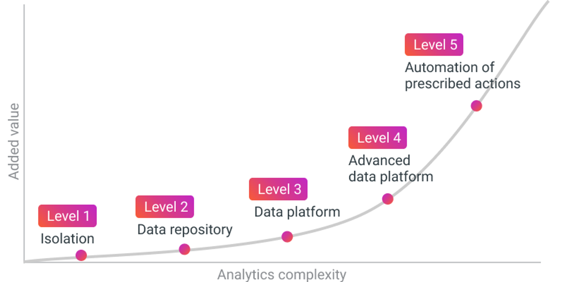 We use a comprehensive framework that helps organizations assess and enhance their data capabilities through five maturity levels, from isolated practices to automation. By understanding where your organization stands on this curve, you can identify improvement areas and take strategic actions to advance your data capabilities. Each level represents a step towards becoming a data-driven organization with efficient, scalable, and industry-aligned data management processes. Achieving higher levels of data maturity not only optimizes costs and mitigates risks, but also supports business growth by allowing the scaling of data infrastructure as needed.